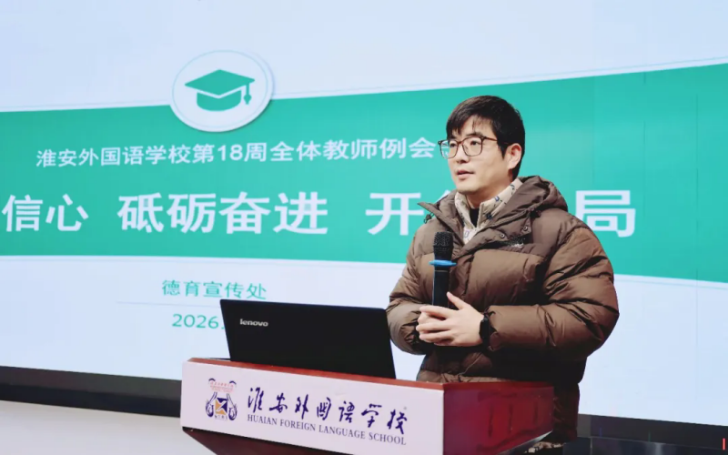 1月5日下午5时30分,淮安外国语学校阶梯教室灯火通明,洋溢着温暖而奋进的气氛。在德育处刘杰主任的主持下,一场以“满怀信心,砥砺奋进,开创新局”为主题的第19周教师例会正在举行。活动内容充实,环环相扣,充分展现了学校师生的精神风貌和治校理念。