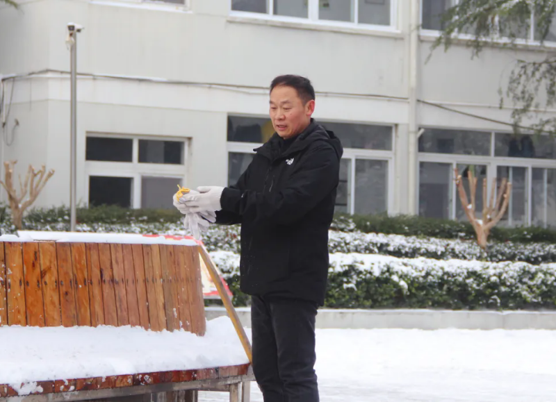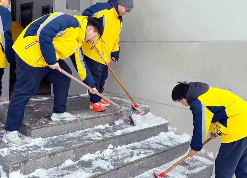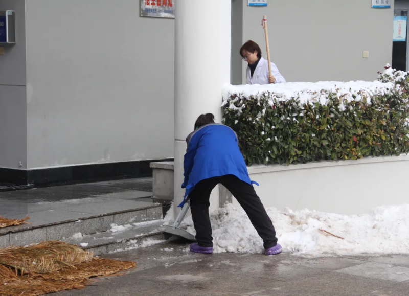 扫雪第二小分队则聚焦校园“安全关键区”,对教学楼出入口、校园主要通道、食堂周边等师生高频活动区域进行重点清扫。队员们细致铲除路面薄冰、清理残留积雪,确保校园内无一处积雪盲区,为全校师生筑牢了冬日出行的“安全防线”,让校园在雪景中依旧秩序井然。
