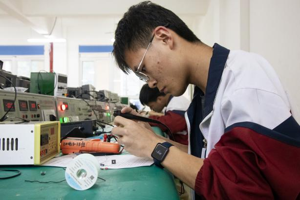 电子电路安装与测试比赛的时间十分紧迫,参赛的同学没有因此而乱了方寸,聚精会神、泰然自若地进行着电路板的安装焊接与调试。他们精细的操作向我们展示了电子电工专业的魅力。