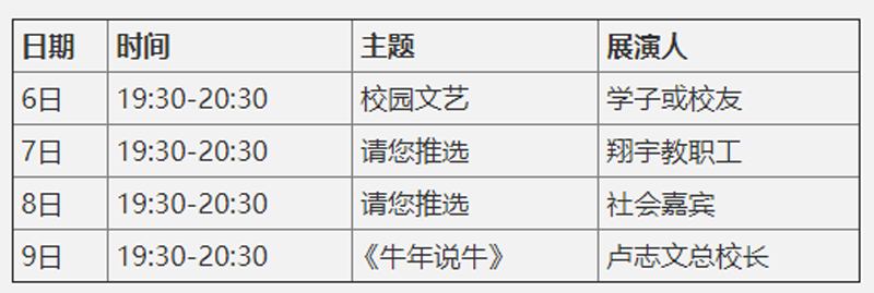 以视频+现场互动形式呈现。主题与教职工相仿,也可以是优秀的文艺节目。